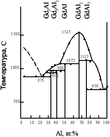 В работе [64] исследована система алюминий – гадолиний методами микроскопического, термического и рентгеновского анализов (рис3.2.). В сплавах системы образуются 5 интерметаллических соединений, из них только одно – GdAl2 плавится с открытым максимумом при 1525˚С. Остальные 4 – Gd2Al, Gd3Al2, GdAl и GdAl3 – образуются по перитектическим реакциям при температурах 950, 980, 1075 и 1125˚С соответственно. Кроме того, в сплавах системы кристаллизуются две эвтектики: одна со стороны гадолиния при 875˚С, вторая со стороны алюминия при 650˚С. Сплавы изготовляли методом дуговой плавки в атмосфере очищенного аргона.