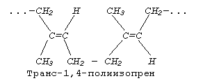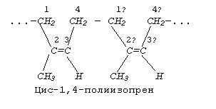 Сопряженные диеновые углеводороды при ионной полимеризации в зависимости от характера катализатора образуют различно построенные полимерные цепи. Различают два типа цепеобразования: цис-1,4, транс-1,4 и цис-1,2. Полимеризация изопрена в присутствии триалкилалюминия и хлорида титана (IV) приводит у цис-1,4-полимеру, в котором цис-построеные остатки диена связаны друг с другом в положении 1,4: