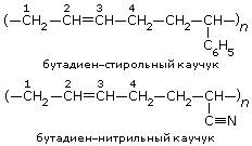 В молекулах этих каучуков звенья бутадиена чередуются со звеньями соответственно стирола и акрилонитрила.