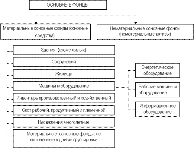 По видам основные средства организаций подразделяются на следующие группы: здания, сооружения, рабочие и силовые машины и оборудование, измерительные и регулирующие приборы и устройства, вычислительная техника, транспортные средства, инструмент, производственный и хозяйственный инвентарь и принадлежности, рабочий, продуктивный и племенной скот, многолетние насаждения и прочие основные средства.