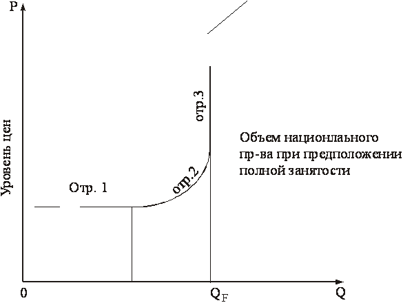 На первом отрезке общие расходы, то есть сумма потребления, инвестиции, правительственных расходов и чистого экспорта, до такой степени низки, что объем национального продукта сильно отстает от своего максимального уровня при полной занятости. Другими словами, существует значительное отставание реального объема ВВП. Уровень безработицы высок, а большая доля производственных мощностей предприятий бездействует. Теперь предположим, что совокупный спрос повысится. Тогда объем производства увеличится, уровень безработицы снизится, а уровень цен возрастет незначительно или вовсе не изменится. Это объясняется тем, что существует огромное количество бездействующих трудовых и материальных ресурсов, которые можно ввести в действие при существующих на них ценах.