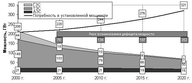 Для надежного обеспечения прогнозируемого спроса на электроэнергию уже с 2003 г. потребуется увеличение суммарной установленной мощности электростанций России. С учетом прогнозируемого роста нагрузок, необходимого резерва и невозможности полного использования установленной мощности ГЭС в зимний период потребность в установленной генерирующей мощности оценивается в 2005г. — 220 млн. кВт, в 2010г. — 244, в 2015г. — 276 и в 2020г. — 321 млн. кВт (рисунок 3).