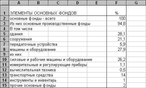 Видовая структура основных фондов различна в отраслях промышленности. Например, доля зданий в общей стоимости основных фондов наиболее велика в пищевой промышленности (44%), сооружений - в топливной промышленности(17%), передаточных устройств - в электроэнергетике (32%), машин и оборудования - на предприятиях машиностроительного комплекса (45% и свыше ).