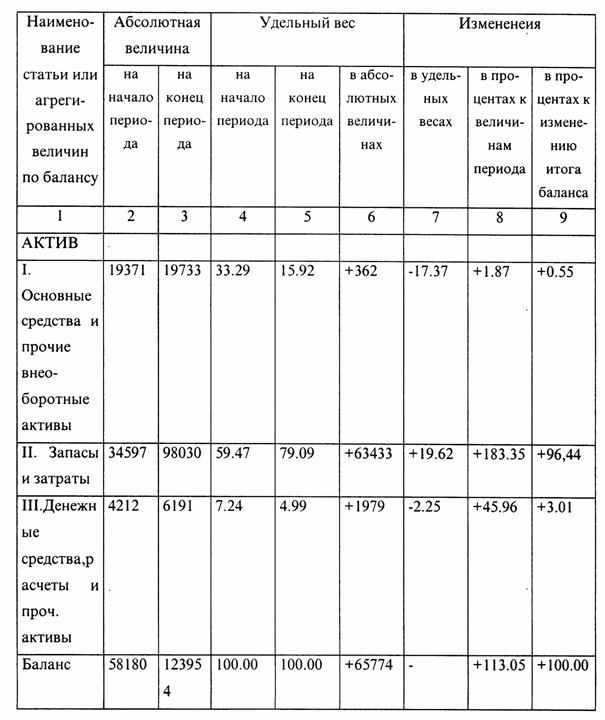 . Изучение баланса предполагает изучение структуры и динамики финансового состояния предприятия. Изучение структуры баланса (вертикальный анализ) предполагает вычисление и рассмотрение удельного веса отдельных статей в итоге баланса, Абсолютные и относительные изменения отдельных статей баланса (горизонтальный анализ) дают представление о динамике финансового состояния предприятия.