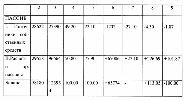 В графе 9 показаны изменения абсолютных величин статей в процентах к изменению итога баланса. Расчет производят путем деления каждой статьи по гр. 6 на изменение итога баланса по гр. 6 и умножением на 100.