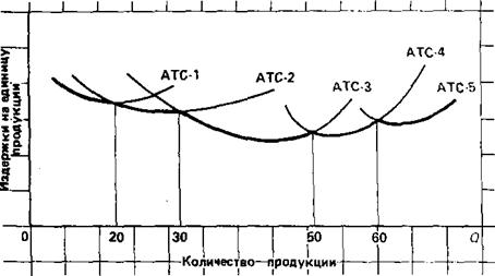 На графике эта закономерность проиллюстрирована применительно к пяти различным размерам предприятия. Кривая АТС-1 показывает динамику средних общих издержек для самого маленького из пяти предприятий, кривая АТС-5 — для самого большого. Соотношение между этими пятью кривыми в точности соответствует изложенному выше правилу. Строительство все более крупных предприятий будет приводить к снижению минимальных издержек на производство единицы продукции вплоть до достижения размеров третье предприятия. Однако за этим пределом расширен производственных мощностей будет означать повышение минимального уровня средних общих издержек.