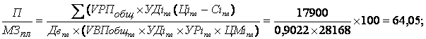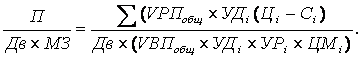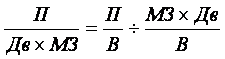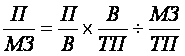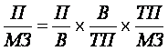 где П/МЗ - прибыль на гривну материальных затрат; Л/В -рентабельность продаж; В/ТП - удельный вес выручки в общем объеме выпуска товарной продукции (Дв); ТП/МЗ - материалоотдача, МЗ/ТП - материалоемкость; МЗ´Дв - материальные затраты в стоимости реализованной продукции.