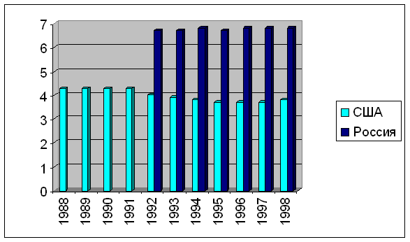 Для сравнения на рис. 2 показана динамика годовой добычи и запасов нефти в России и США в период 1988-98 гг. Приведенная на нем диаграмма иллюстрирует не столько степень падения добычных возможностей нефтяного комплекса России, сколько их потенциал, поскольку главной причиной падения добычи следует считать спросовые ограничения, оставившие невостребованными имеющиеся возможности.