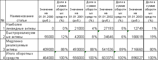В целом можно сделать вывод, что в 2000 году оборотные средства, а с ними и все предприятие, стали более ликвидными, т.к. доля медленно реализуемых активов осталась прежней, а часть быстрореализуемых активов перешли в более ликвидную категорию.