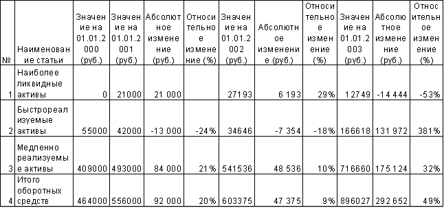 Анализируя темпы роста, можно говорить о замедлении тенденций прошлого (2000-го) года. Так, продолжился рост наиболее ликвидных активов, но в меньшей степени : увеличение на 6 193 руб. в 2001 году против 21 000 руб. в 2000 году; продолжилось падение быстрореализуемых активов – на 18%, что все же меньше 24%-ного падения 2000 года; также , как и в 2000 году увеличились медленно реализуемые активы, но на 10% по сравнению с 21% роста в 2000 г. . В итоге, оборотные средства также увеличились, но на 9% по сравнению с 20% роста 2000 года.