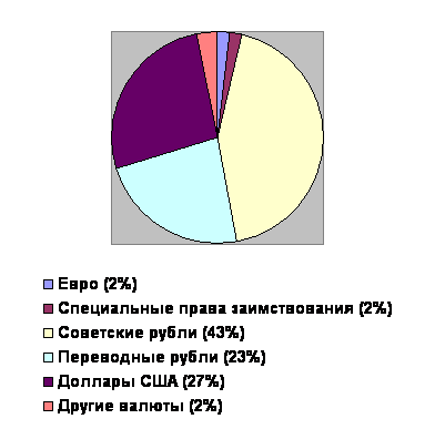 Рассмотрим структуру долга перед Россией в разрезе валют, в которых номинирован долг иностранных государств (за исключением стран СНГ). Как видно из таблицы выше из рисунка 3, большая часть иностранного долга перед Россией (около 60%) номинирована в советских и переводных рублях, то есть в валюте не существующего в настоящее время государства. Данное обстоятельство серьёзно усложняет переговорную позицию России при урегулировании долгов иностранных государств, так как даже в случае признания ими долга перед нашей страной остаётся проблема пересчёта курса валют, по которым будет погашаться. Соответственно возникают сложности и в планировании бюджетных доходов страны, связанных с поступлениями от выплат по иностранному долгу перед Россией.