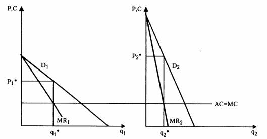 Соответственно, раз функции предельной выручки различны (что определяется по условию различием ценовых предпочтений потребителей и, следовательно, различными функциями совокупного спроса каждого сегмента рынка), цены будут разными в зависимости от ценовой эластичности спроса для каждой группы: