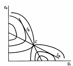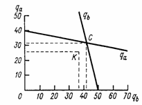 В графическом виде результат решения рассматриваемого примера представлен на рис. 13. Точка С на пересечении линий реакции фирм А и В определяет их выпуск в состоянии равновесия по Курно, а точка К — при образовании картеля. При пассивном поведении фирмы В точка, представляющая объемы выпуска каждой из фирм, находится на линии реакции фирмы В, левее точки С; при пассивном поведении фирмы А эта точка расположена на линии реакции фирмы А, правее точки С.
