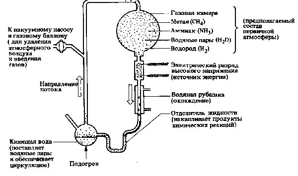 В 1953 г. Стэнли Миллер в ряде экспериментов моделировал условия, предположительно существовавшие на первобытной Земле. В созданной им установке (рис. 24.1), снабженной источником энергии, ему удалось синтезировать многие вещества, имеющие важное биологическое значение, в том числе ряд аминокислот, аденин и простые сахара, такие как рибоза. После этого Орджел в Институте Солка в сходном эксперименте синтезировал нуклеотидные цепи длиной в шесть мономерных единиц (простые нуклеиновые кислоты).