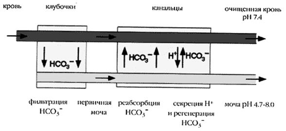 На первом этапе образования мочи (клубочковая фильтрация) образуется ультрафильтрат плазмы, представляющий собой первичную мочу, по составу аналогичную плазме. В первичной моче содержится значительное количество бикарбоната, который организму необходимо сохранить. Поэтому, когда уровень бикарбоната в плазме падает ниже физиологических показателей, в проксимальных канальцах почек при участии фермента карбоангидразы начинается процесс реабсорбции профильтрованных в клубочках бикарбонатных ионов.