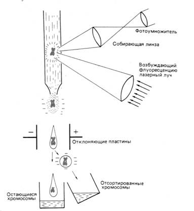 Рис. 3. Принцип сортировки хромосом с помощью лазера. Хромосомы окрашены флуоресцирующим красителем. Флуоресценция возбуждается лазерным лучом и измеряется для каждой хромосомы отдельно. Данные измерений используют для сортировки хромосом.