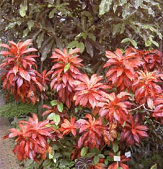 КОДИЕУМ ПЁСТРОЛИСТНЫЙ (Codiaeum variegatum) широко культивируемый как в тропических (в открытом грунте), так и в умеренных и холодных странах (как комнатное растение), является одним из наиболее известных декоративных молочайных. Имеется большое число сортов, различающихся главным образом пестрой, разноцветной окраской листьев. В роде кодиеум около 15 видов, распространенных в Малезии, Полинезии и Северной Австралии.