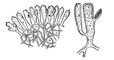 Codium tomentosum: 1 — часть поперечного разреза слоевища; 2 — участок наружного слоя (при большем увеличении) с гаметангием (справа).