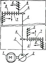 1 и 2 — насосная станция; 3 и 5 — первый и второй участки магистрального трубопровода; 4— гидрант магистрального трубопровода; 6 — оросительный трубопровод; 7 — гидрант распределительного трубопровода; 8 — среднеструйный дождевальный аппарат; 9 —распределительный трубопровод.