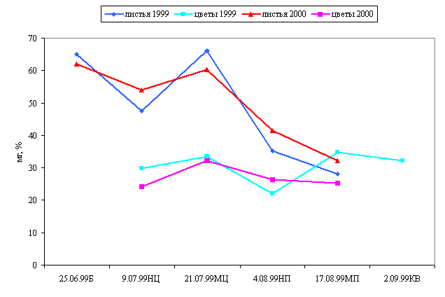 В фазу массового цветения в 1999 году количество аскорбиновой кислоты в листьях Ромашки аптечной составило 66 мг %, в то время как в 2000 году – 60 мг % (рис. 8). Накопление аскорбиновой кислоты обусловлено быстрым темпом биосинтетических процессов, происходящих в листьях, в результате которых шло образование питательных веществ и витаминов, необходимых для формирующихся соцветий.