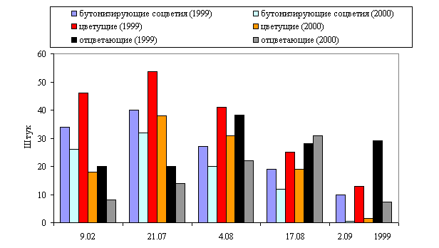 В 2000 году генеративная мощность Ромашки в этот период составила 52 соцветия с растения с преобладанием бутонизирующих корзинок – 26шт., число цветущих было равно 18 шт., остальная часть приходилась на отцветающие корзинки (рис.5), причем, размеры соцветий были больше, чем в предыдущем году исследования. Диаметр соцветий составлял 2,4см (прил.4). Небольшая генеративная мощность Ромашки в 2000 году к началу цветения обусловлена ранним наступлением фазы бутонизации (18.05), когда невысокие температуры и недостаточное количество солнечного света тормозили закладку генеративных органов. Поэтому растения не успели сформировать большого количества соцветий.