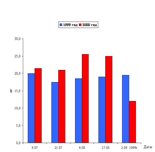 Температура в оба года исследования не превышала 17°С (рис.3), а количество осадков составляло в 1999 году 32,6мм, а в 2000г. – 27,2мм (рис.4). По-видимому, такие условия благоприятны для развития растений, т.к. способствуют успешному протеканию физиологических процессов, таких как фотосинтез и дыхание.