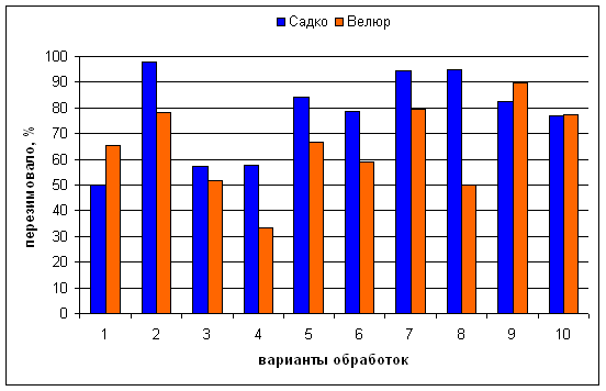 Рисунок 10. Влияние внекорневых обработок зеленых черенков крыжовника сортов Садко и Велюр на перезимовку.