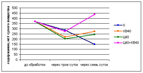При комплексной обработке (Ц-40+КВ-40) прослеживается та же закономерность, но различия с контролем по сумме ЦТК и ИУК выше, чем в вариантах Ц-40 и КВ-40 (табл. 5; рис. 11, 12, 13). Этот фактор, вероятно, в значительной степени и определяет успех корнеобразования у стеблевых черенков крыжовника при обработке смесями цитокининов с кремнийорганическими соединениями.