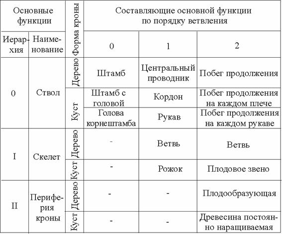 Анализ данных таблицы 3 показал, что, с позиции теории систем, вся гамма форм архитектоники многолетнего растения строится на трёх основных иерархически подчинённых функциях: ствола, скелета и периферии кроны. Каждая из этих функций отдельный организм, имеющий сугубо свою цель, но закономерность построения этих организмов однотипна - обязательная соподчиненность последующих порядков предыдущим, «с размещением в пространстве таким образом, чтобы занять в нём минимальный объём» (Ф.Патури, 1979). По положению в пространстве нарастание тела растения происходит апикально (верхушек побегов 1, 2, 3 и т.д. в длину) и латерально (вторичное утолщение уже выросших органов растения