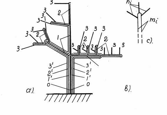 Рис. 1. Модульное с) нарастание дерева а) и куста в);