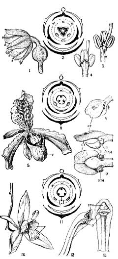 Рис.1. Строение цветков в семействе орхидных (из «Жизни растений») Подсемейство апостасиевые (Apostasioideae), неувидия Ины (Neuwiedia inae): 1. – цветок (чашелистики и лепестки с выраженным килем); 2. – диаграмма цветка; 3,4 – колонка в двух положениях. Подсемейство циприпедиевых (Cypripedioideae), пафиопедилум замечательный (Paphiopedilum insigne): 5 – цветок с мешковидной губой; 6 – диаграмма цветка; 7, 8, 9 – колонка в разных положениях. Подсемейство однотычинковых орхидей (Orchidoideae), целогина повислая (Coelogyne flaccida): 10 – цветок; 11 – диаграмма цветка; 12 – разрез колонки; 13 – колонка; ст. – стаминодий, п. – рыльце, кл. – клювик, плн. – пыльник, г. – губа. |
