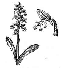 Растение с яйцевидным клубнем. Прицветники фиолетово-розовые, яйцевидные, заостренные, 2—3 мм длины. Цветки с приятным запахом. Цветет в апреле—мае.