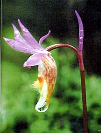 Растет у нас и еще один вид орхидеи - "венерин башмачок". Он до того прекрасен, что и впрямь может быть посвящен богине любви и красоты. Его волнистые, словно летящие темно-пурпурные лепестки легки и изящны. Губа у башмачка вздута и похожа на переднюю часть атласной туфельки.