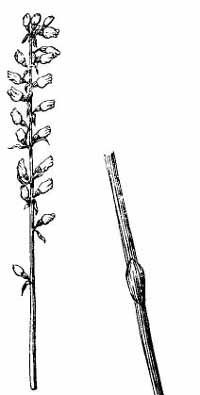 Бесхлорофилльное растение (сапрофит), с горизонтальным клубнеобразно утолщенным корневищем, лишенным корней, и стеблем с чешуевидными стеблеобъемлеющими темно-бурыми листьями. Кисть 15—25 см длины, 2,5—3,5 см ширины, редковатая. Околоцветник трубчатый, наружные и 2 внутренних его листочка срослись в трубку с 5 короткими туповатыми лопастями, заключающую в себе свободную (лишь у основания приросшую) продолговато- овальную, по краю бахромчатую, беловатую губу. Цветет в июле — августе.