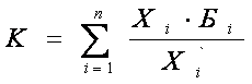 Где К-коэффициент сводной оценки (интегральный показатель) социальной ситуации; Хi – i-ый частный показатель социальной ситуации; Xi со штрихом – i-ый частный показатель социальной ситуации в целом по народному хозяйству; Бi-экспертная бальная оценка i-го частного показателя; n- число частных показателей.