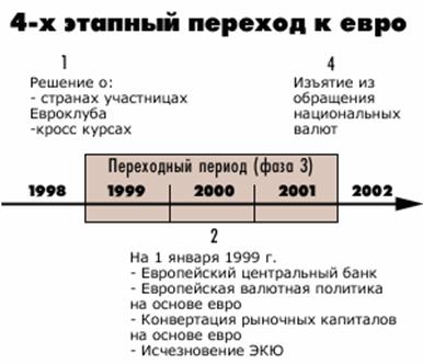 Процедура ввода евро в обращение разделена на три (четыре) этапа. На первом этапе, который начался 1 января 1999 года, евро будет использоваться в безналичных расчетах наравне с национальными валютами стран-участниц ЭВС, конечно при условии, что страны будут соответствовать "критерию слияния", включающему ряд экономических показателей, о которых было сказано выше.