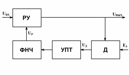 В АРУ с обратной связью выходное напряжения Uвых после детектора Д (Uд) усиливается усилителем постоянного тока УПТ с коэффициентом усиления Купт и через фильтр низких частот ФНЧ, обеспечивающий инертность АРУ, регулирующее напряжение Uр таким образом изменяет коэффициент передачи регулируемого усилителя РУ, содержащего np регулируемых каскадов.