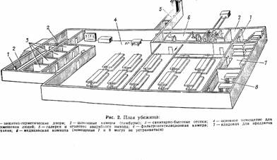 Входы в убежище в большинстве случаев оборудуются в виде двух шлюзовых камер (тамбуров), отделенных от основного помещения и перегороженных между собой герметическими дверями.