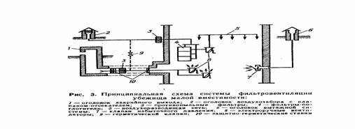 Фильтровентиляционный агрегат-это обычно агрегат ВФА-49, ФВК.1 или ФВК-2, состоящий из фильтров-поглотителей, противопыльмого фильтра и вентилятора и входящий в систему фильтравентиляции убежища (рис. 3). В эту систему, кроме того, входят воздухозаборное устройство, воздуховоды, клапаны-отсекатели ударной волны ядерного взрыва, регулирующая аппаратура.
