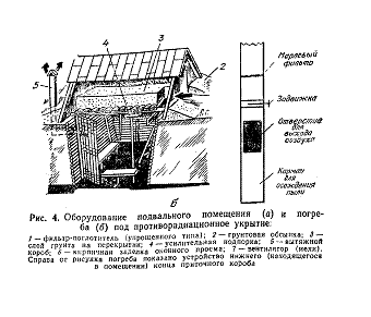 Все щели, трещины и отверстия в стенах и потолках помещений тщательно заделывают, места вводов отопительных и водопроводных труб проконопачивают. На перекрытие насыпают слой грунта в 60-70 см; перекрытие при необходимости предварительно усиливается (дополнительными балками, стойками). Снаружи у стен,
