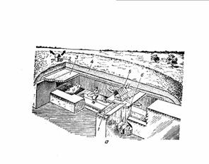 При оборудовании под ПРУ погреба (рис. 4, б) предварительно усиливают его перекрытие, затем на перекрытие насыпают слой грунта в 60-70 см. Крышку люка (лаза) плотно подгоняют. Делают вытяжной вентиляционный короб.