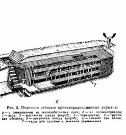 Отдельно стоящее ПРУ, как правило, является заглубленным сооружением (рис. 5). Для строительства его прежде всего роют котлован, в котором устанавливают остов укрытия; при установке деревянного остова используют различные конструкции: сплошную рамную, рамно-блочную, рамно-щитовую, безрубочную и т. д. После сборки остова н соединения его элементов между собой все щели в стенах и перекрытии тщательно заделывают паклей, ветошью, сухой травой; промежуток между стенами котлована и остовом засыпают грунтом, через каждые 20-30 см слон грунта трамбуют. Затем насыпают грунт в месте прилегания перекрытия к земле по всему периметру укрытия. Над перекрытием устраивают гидроизоляцию, используя рубероид, толь, полиэтиленовую
