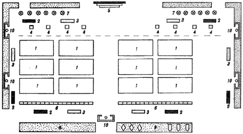1 — строевая площадка; 2 — стенд с рисунками из Строевого устава; 3 — зеркало; 4 — места для линейных; 5 — трибуна; 6 — линия для построения; 7 — флагштоки; 8 — площадка для отработки приемов передвижения на поле боя; 9 — площадка для отработки действий у машин и на машинах 10 — места для курения и чистки обуви