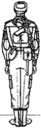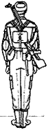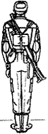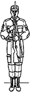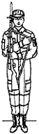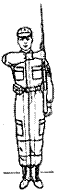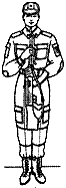 третий прием — быстро перебросить карабин (ручной пулемет) за плечо; левую руку опустить; правую руку опустить по ремню так, чтобы предплечье было в горизонтальном положении; карабин (ручной пулемет) слегка прижать локтем к телу (рис. 8, г, д).