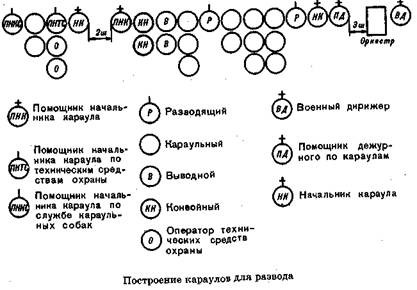 На правом фланге каждого караула становится начальник караула, а на левом фланге — его помощник; разводящие становятся правее своих караульных в первой шеренге. Караульные становятся в порядке номеров постов справа налево, в затылок друг другу в порядке смен, выводные и конвойные — левее их. Транспортные средства караулов с водителями располагаются в отведенном для них месте.