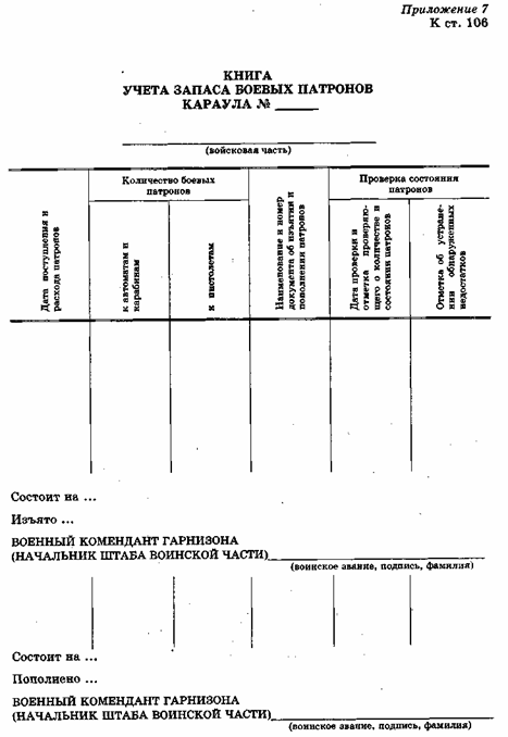 Примечания: 1. Об изъятии (закладке) патронов составляется акт за подписями военного коменданта гарнизона (начальника штаба воинской части), начальника службы ракетно-артиллерийского вооружения воинской части, за которой боеприпасы числятся, дежурного по караулам (по воинской части) и начальника караула. Запас боевых патронов пополняется до нормы, ящик вновь опечатывается и сдается на хранение начальнику караула.