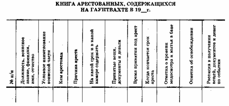Перечень изъятых и принятых вещей, предметов, документов и сумму денег начальник гауптвахты заносит в книгу арестованных в присутствии арестованного и выдает ему расписку в их приеме, после чего направляет арестованного с запиской об аресте к начальнику караула для помещения в камеру.