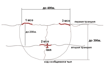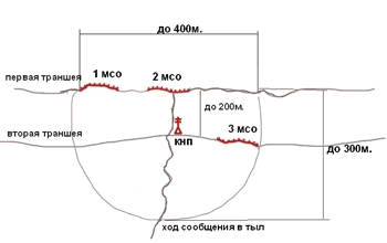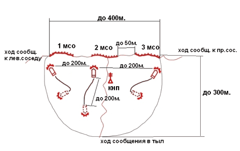 Боевые порядки МСВ преднамеренно показаны в предельно упрощенном виде. Здесь не показаны запасные и отсечные позиции, окопы БМП, позиции огневых средств усиления и поддержки, заграждения, минные поля, пункт боепитания, пункт водоснабжения, средств связи.