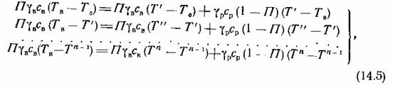 Рассмотрим некоторый объем пласта серной руды пористостью П, из которого предстоит выплавить серу. Пусть начальная температура руды равна Т0. Предположим, что процесс нагнетания перегретой воды в пласт происходит некоторыми порциями Если обозначить температуру перегретой воды через Tв, то после нагнетания первой порции воды температура руды поднимется и станет равной Т /,после нагнетания второй порции температура руды повысится от Т / до Т // и т.д. Для каждой порции нагнетания можно составить систему уравнений теплового баланса, которые имеют вид: