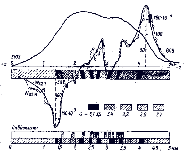 На Курской магнитной аномалии проводятся комплексные геофизические работы (магниторазведочные, гравиразведочные, сейсморазведочные, электроразведочные). На рис. 13 приведен профиль через Лебединское месторождение в Старооскольском районе и геолого-гравиметрический разрез. По кривой силы тяжести WZ в средней части профиля выделяется свита плотных пород. Падение близко к вертикальному. По кривой градиента силы тяжести удается расчленить эту свиту на отдельные пласты с плотностью от 2,7 до 3,9 г/см3. Таких пластов выделено 23.